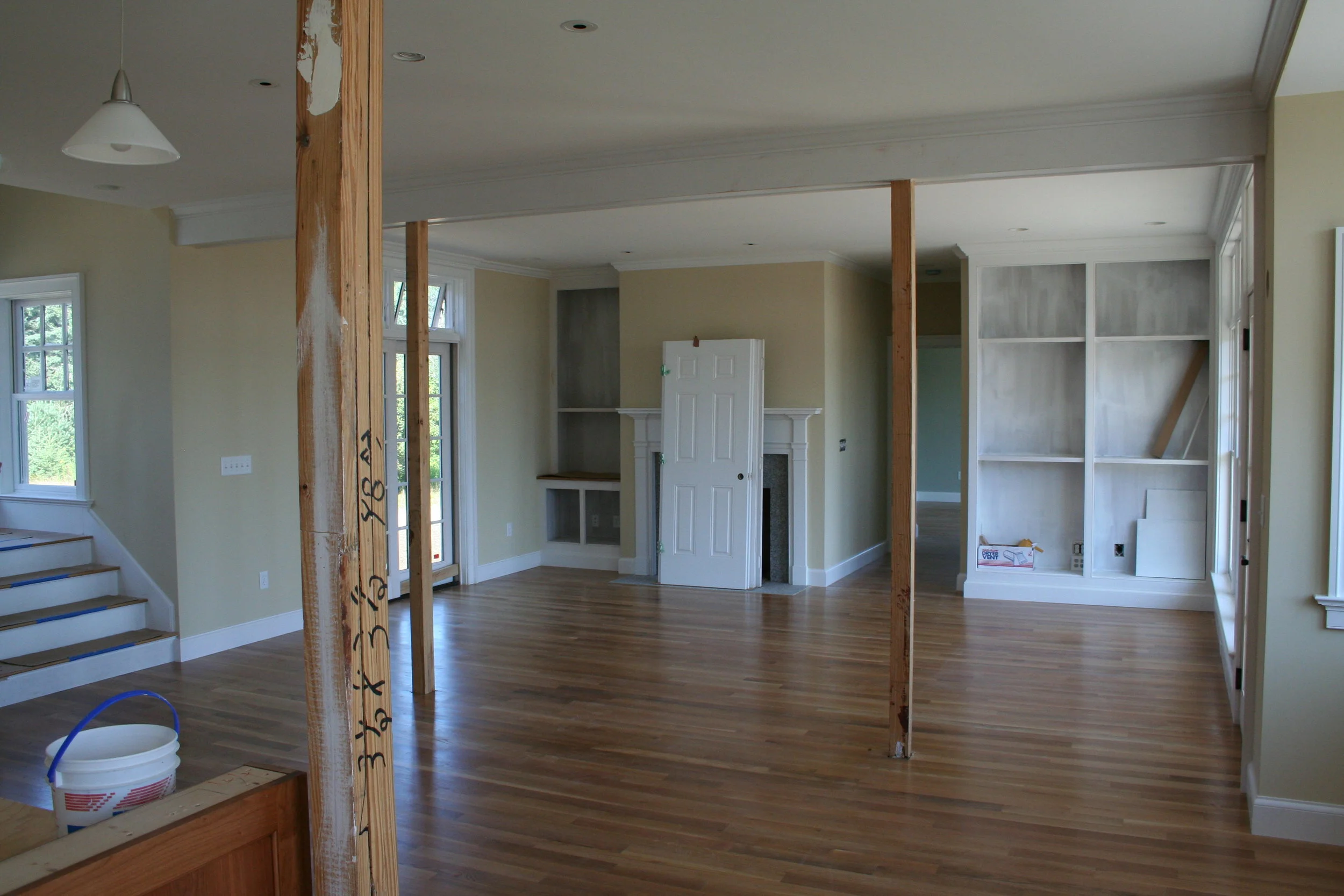 Custom bookshelves and fireplace mantel nearing completion.